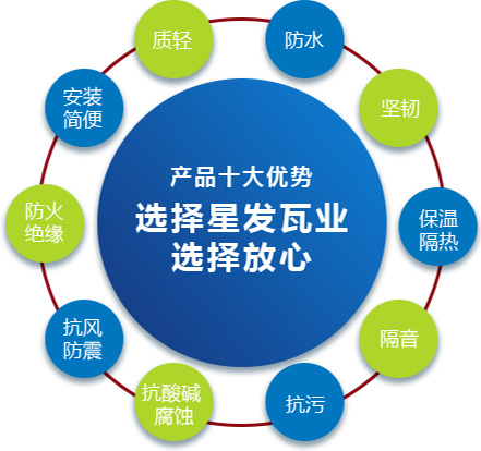 公司主要產(chǎn)品有《星發(fā)牌》合成樹脂瓦、APVC防腐耐候復合瓦、APVC發(fā)泡隔熱瓦、PVC半透明瓦、PVC防腐隔熱瓦、PVC防腐瓦、PVC防腐平板、PVC條紋板和ASA/PVC超耐候復合瓦等產(chǎn)品。產(chǎn)品一經(jīng)推出,已被廣泛應用于國內(nèi)各類平改坡項目和大型工業(yè)項目,遠銷歐洲、亞洲、美洲和非洲等國外市場,還獲選為廣州亞運會、深圳大運會、四川災后重建等工程項目的應用產(chǎn)品。公司在不斷創(chuàng)新和改革的基礎(chǔ)上,力求以更好的產(chǎn)品、優(yōu)良的服務(wù),用心、專心服務(wù)好每一個客戶。